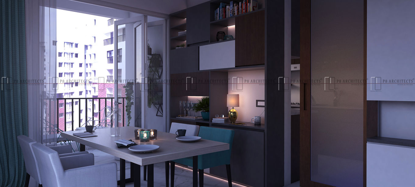 The dining has Light oak tables and white with a splash of turquoise to provide most luxurious feel. The wide glass door brings in the urban landscape and light into the apartment.